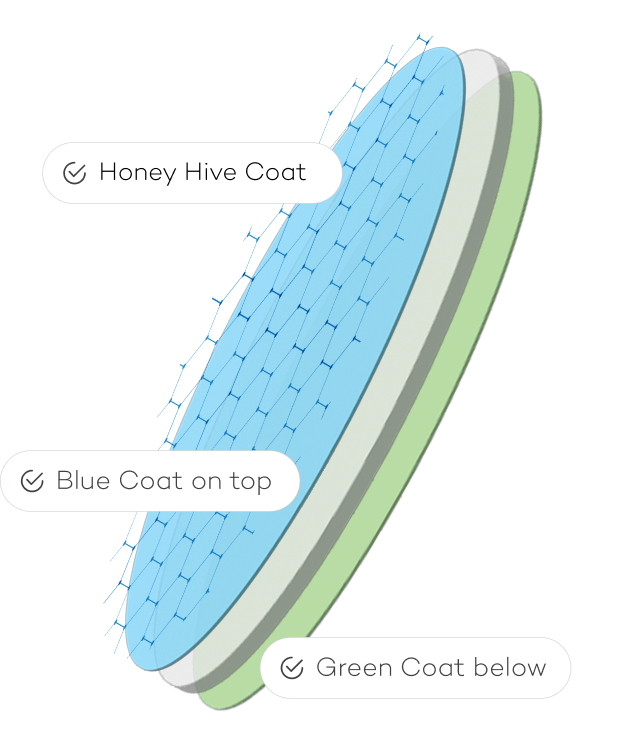 O2 PRO DUAL COAT Honey Hive coating is applied to a lens surface creating a matrix of tiny hexagonal cells.
